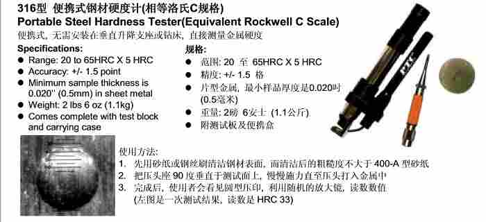 美国PTC316型便携式钢材硬度计(相等洛氏C规格)|美国PTC硬度计,便携式,无需安装在垂直升降支座或钻床,直接测量金属硬度。