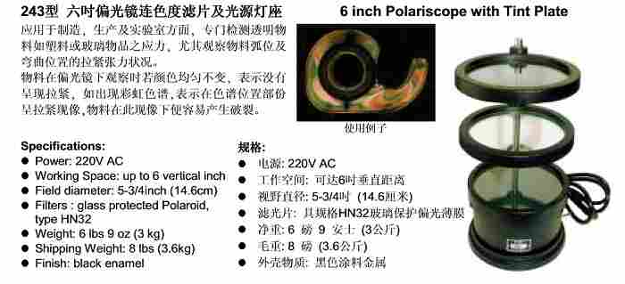 美国PTC 243型六吋偏光镜连色度滤片及光源灯座 43型六英寸偏光镜连色度片及光源灯座 应用于制造,生产及实验室方面,专门检测透明物料如塑料或玻璃物品之应力,尤其观察物料弧位及弯曲位置的拉紧张力状况。