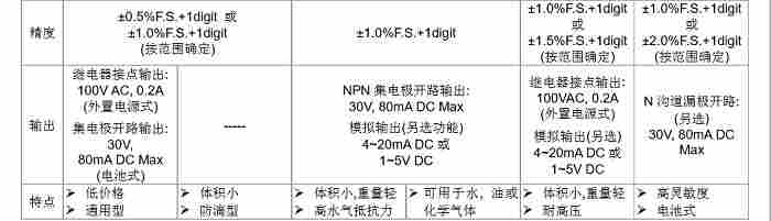 输出方式:继电器接点输出;100VAC,0.2A(外部电源式);集电极开路输出:30V,80 mA Dcmax(电池式)