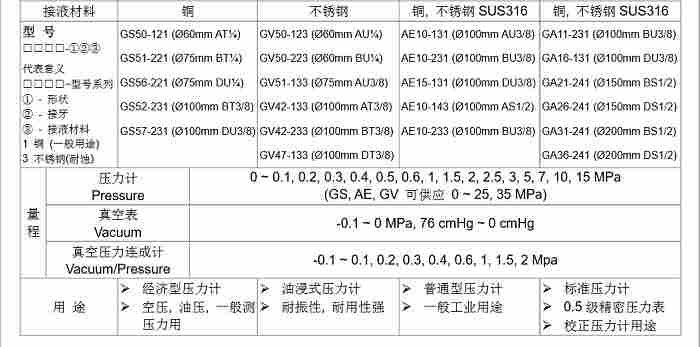 压力范围:O形圈型:-0.1~0至-0.1~2MPA. 0~0.1至0~10MPA