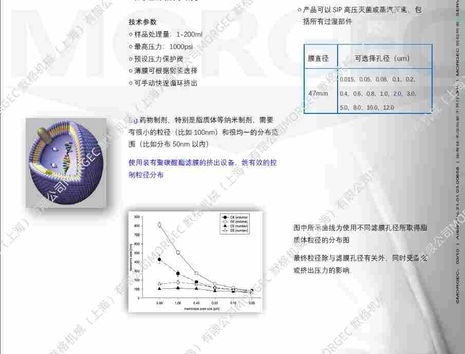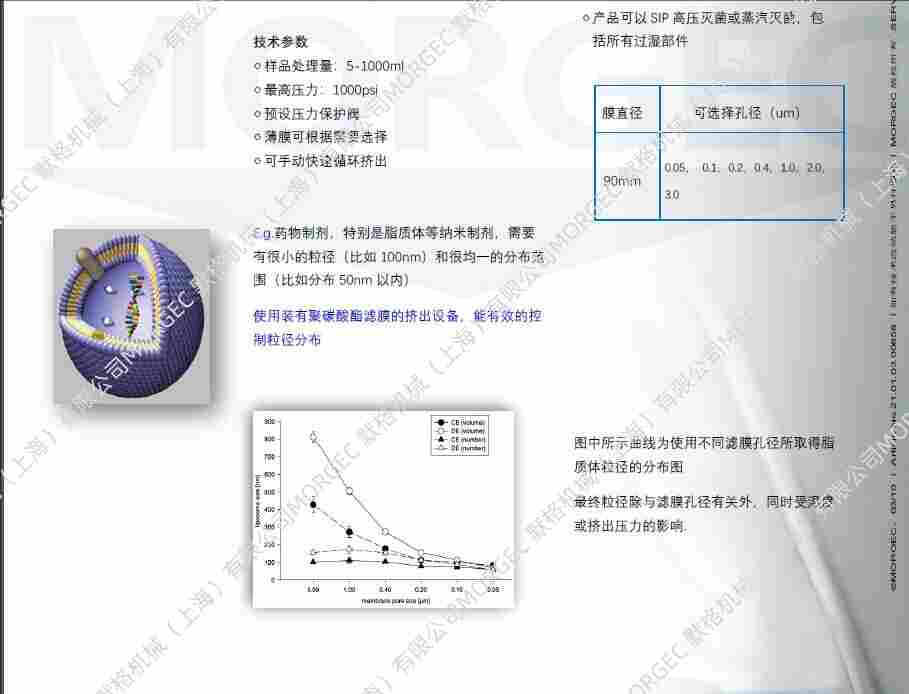 通过调节氮气瓶出口压力,挤压样品通过聚碳酸酯膜与AISI316L不锈钢滤板,挤出后的样品,其粒径分布均匀,可达到纳米级,样品的粒径大小与挤出压力及PC滤膜的孔径有关。