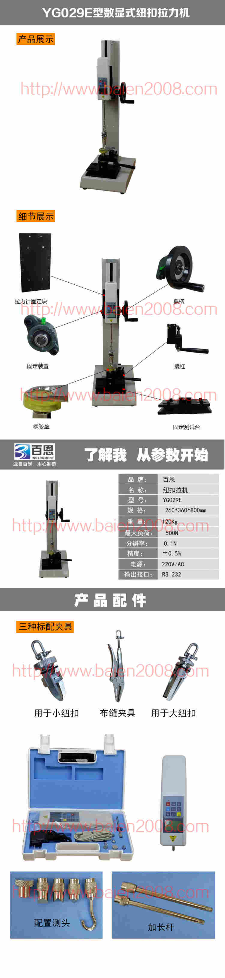 YG029E型钮扣拉力机,可配置NK、 HP系列推拉力计和夹具,于测量钮扣的扣合力或脱离衣物破坏力。检测钮扣、按钮等固定强度是很重要的一项标准,尤其是在婴儿和儿童服装设计及制造中为重要。在钮扣固定装饰件上使用一定力的测量需要通过力度仪器来记录。