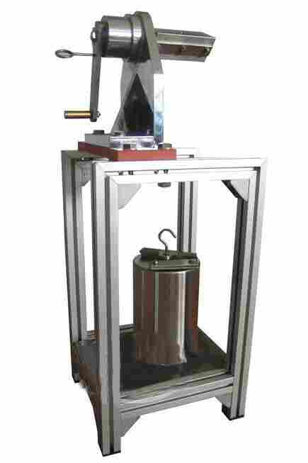 本装置对 10° 和 230° 位置进行机械限位,以确保试验角度的准确性,同时也实现了操作方法简单化;砝码附有挂环,以防试样某点因受力过大而被拉破。