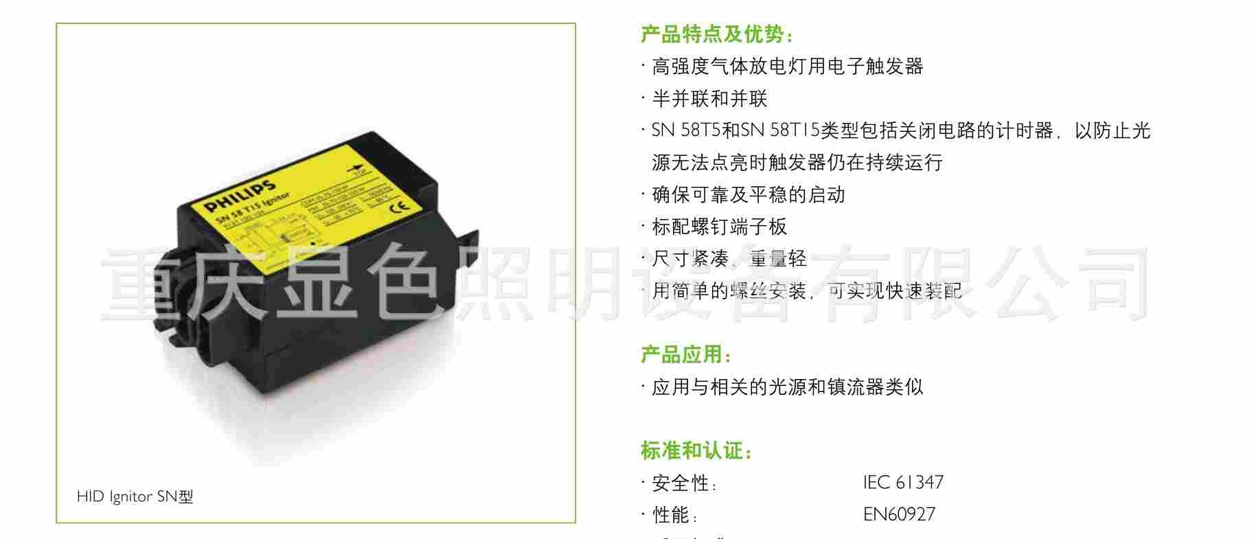 触发器的功率主要是提供高压的脉冲来启动光源,飞利浦HID电子触发器起动次数多,符合IEC926安全要求和IEC927性能要求,经VDE、DEMA、SEMKO、SEU等多家机构检验通过,工作温度范围广,性能稳定