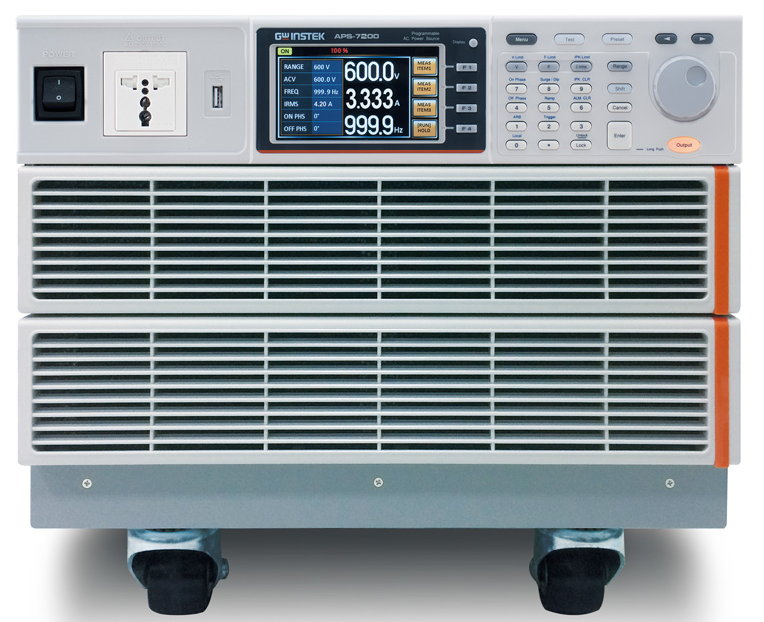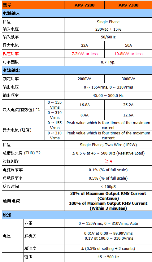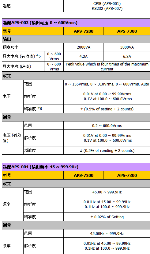 •输出容量: APS-7200(2000VA、310Vrms、16.8Arms)/ APS-7300 (3000VA、310Vrms、25.2Arms)。可经由选配附件扩充输出为(0~600Vrms/45~999.9Hz)。