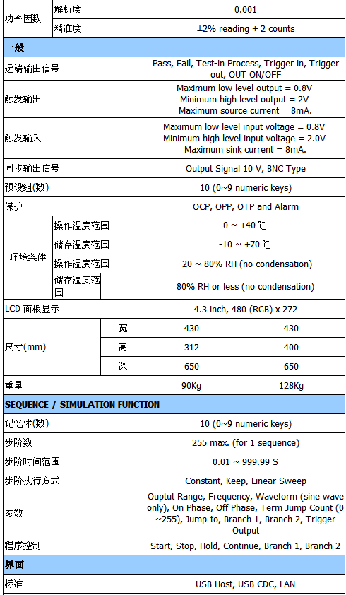 •10组Sequence function允许编辑输出波形/10组simulate mode快速模拟电源暂态/10组Program mode自订测量顺序10组面板记忆功能