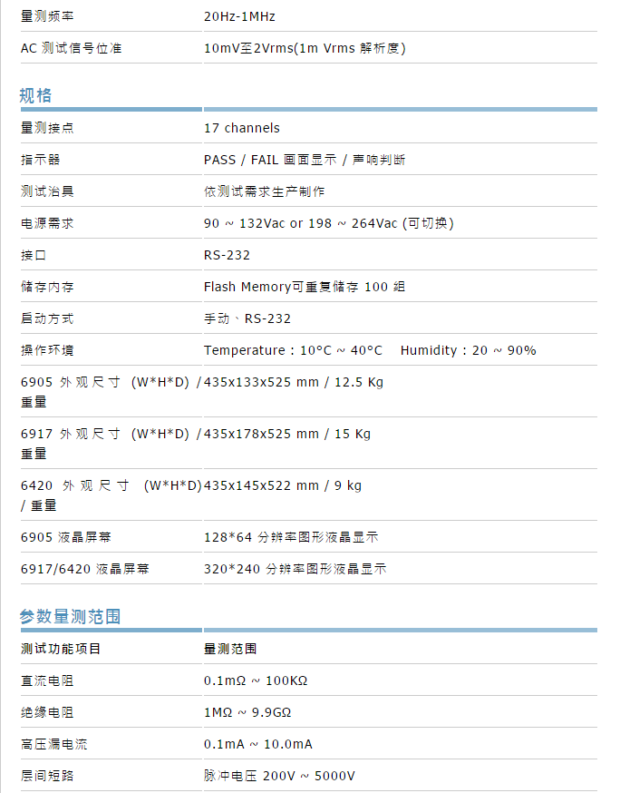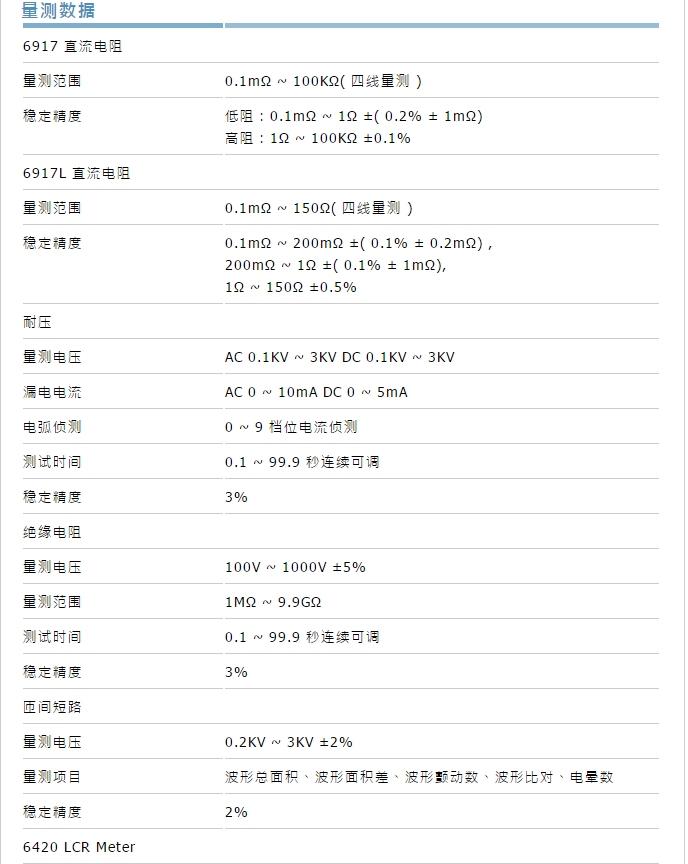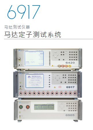 6917马达定子测试系统搭配6917(层间短路、线圈测试仪)及6905(耐压、绝缘测试仪),另外可以选购搭配6420 LCR Meter,量测电感。配备8个四线量测之独立测试点,有17个信道,测试项目包含:直流电阻测试-它可针对铜线在绕线时过紧、断线或接线等错误给予检测,除此之外,在安规上所需之耐压测试与绝缘测试,以及客户所重视之层间短路等项目均包含其中。层间短路测项搭配之层间短路测试机,采取波形比对,避免「电晕现象」造成的可能损坏,提供国际大厂标准测试项目完整的解决方案,为您的产品进一步把关;再配合可程序化之设定与简易的操作接口,马达定子测试系统可快速导入生产线与质量管理中心。