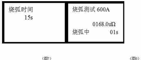 按确定键进入测试模式设定:按 键调节测试模式为烧弧,继续按确定键仪器进入烧弧测试子菜单,烧弧测试分:15s、30s、60s和自定义(0-60s),按 键调节烧弧测试时间,按确定键确定,继续按确定键开始测量,倒计时1s显示测量结果,按打印键打印本次测量结果,测量过程完成。(如上图7;8),如在测量过程中需终止测量请按复位键即可。按设置键返回主菜单。