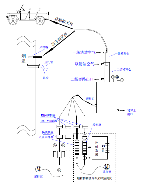 参考标准与规范: 《大气颗粒物来源解析技术指南(试行)》 设备结构: 设备由采样器、稀释器、撞击式分级采样装置、粒径监测器、微弱信号采集处理器、分粒径监测软件,以及外围辅助装置构成。产品开发过程中,开发组利用大型计算机对采样、稀释、分级撞击采样器、粒径监测器进行模拟,针对不同中位粒径在不同的浓度场、速度场进行反复实验、验证。并用实验方法对测试结果进行检测,做到数据拟合度达到95%以上。 系统结构示意图: