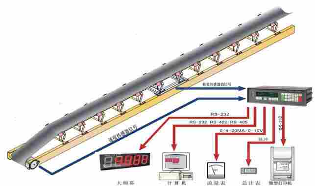 称重桥架安装于输送机架上,当物料经过时,计量托辊检测到皮带机上的物料重量通过杠杆,并作用于称重传感器,产生一个正比于皮带载荷的电压信号。速度传感器直接连在大直径测速滚筒上,提供一系列脉冲信号,每个脉冲表示一个皮带运动单元,脉冲的频率正比于皮带速度。称重仪表从称重传感器和速度传感器接收信号,通过积算器运算求出一个瞬时流量值和累计重量值,并分别在称重仪表上将瞬时流量和累计重量显示出来。仪表也可同时输出正比于瞬时流量的模拟电流信号,传送给DCS系统进行处理,显示电子皮带秤的瞬时流量和累计量以及自动化管理。