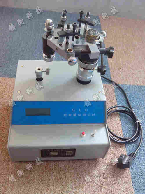 将被检千分尺类(外径千分尺、公法线千分尺、数显千分尺、测深千分尺、内测千分尺等)放入六角夹持盘相应位置(参看示意图)并锁紧。打开电源开关,按下开机清零按钮,使显示窗数字为零。转动横臂及六角夹持盘,使被检千分尺活动测杆对准受力盘的钢球位置,旋转立柱上的升降罗母,使被检千分尺临近接触到受力盘的钢球时,即锁紧定位螺钉、横臂定向螺钉及六角夹持盘的紧固罗母。旋转千分尺测力装置,使千分尺活动测杆与受力盘球面接触,当棘轮发出打滑声时,仪器显示屏显示的数值,即为千分尺此时的测力。
