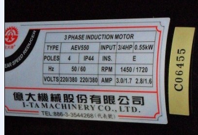 PHASEINDUCTIONMOTOR 1/4HP 4POLES VOLTS220/380v 220/380V HZ5060 RPM14501720 AMP0.6/0.40.6/0.4减速机标识:TYPE:FME18 INPUT:1/4HP RATIO:160 DATE:2001.11
