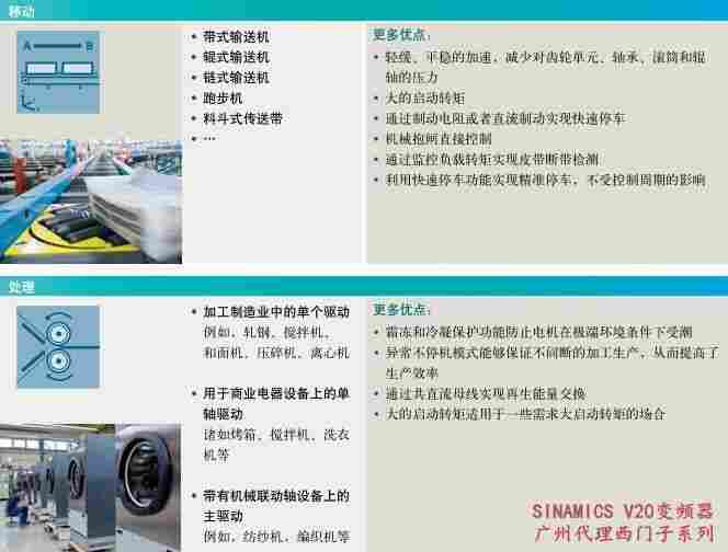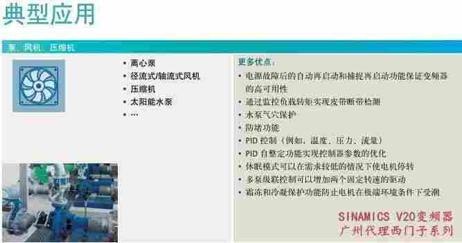 SINAMICS V20,满足通用需求的多功能变频器现如今,工厂与机械制造业的自动化需求日益增多。传统的集成式控制系统被逐渐分割为独立的运动控制过程,相应简化了每个工艺步骤的复杂性。西门子推出的基本型变频器 SINAMICS V20 针对此类应用为用户提供了简易、经济的驱动解决方案。SINAMICS V20 具有调试过程快捷、易于操作、稳定可靠以及经济高效的特点。该款变频器有七种尺寸可供选择,输出功率覆盖 0.12 kW ~30kW。成本***小化工艺设计、调试和操作成本以及运行过程中产生的其它成本都必须尽可能的低。针对这一点,SINAMICS V20 必定是您的选择。此款变频器所配备的控制技术能够通过自动减少磁通来实现的能量效率。不仅如此,变频器还可以显示实际的能耗数值,同时提供额外的节能功能。由此大幅度地降低能耗.