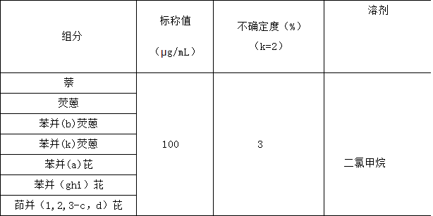 本标准物质采用纯度准确定值的萘、荧蒽、苯并(b)荧蒽、苯并(k)荧蒽、苯并(a)芘、苯并(ghi)苝、茚并(1,2,3-c,d)芘纯品为原料,以二氯甲烷为溶剂,采用重量-容量法准确配制而成。
