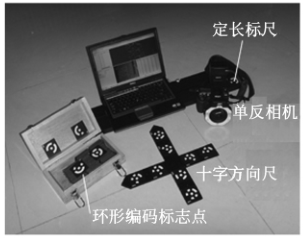 系统基于近景摄影测量和立体视觉技术,以数码相机拍摄到的测量对象多角度照片组作为原始数据。硬件由单反数码相机 CANON400D 、环形闪光灯、磁性环形编码标志点、十字方向尺、比例尺和非编码点(作为测量目标的普通圆形标志点)组成。单反数码相机 CMOS芯片尺寸为23.6mm×15.8mm ,像素大小为6.09 μ m×6.09 μ m ,分辨率为 3 872×2 592 ;光学镜头采用尼康 20mm定焦镜头。