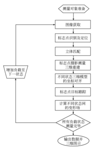 获取每个状态的原始数据输入测量软件中进行全自动测量。在测量软件中,先对拍摄的照片组进行图像处理,检测出本组图像中所有标志点的二维图像坐标,根据图像中的编码点完成定向,利用外极线几何关系实现非编码点的匹配 ,采用含相对控制的光束平差解法计算出所有标志点的三维空间坐标,后将各状态的坐标系对齐后计算两个状态之间的变形场。