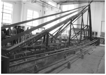 2008 年南方雪灾中失效的输电塔架,主要承受的是堆积在塔架梁杆上冰雪的重力负载,为模拟垂直压力,将塔架水平放置于地面上,两端使用水压机加压,从侧面进行观测。
