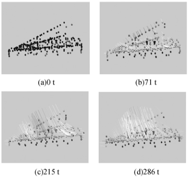全部测点的整体变形情况可以在测量软件的3D 窗口中进行观察,图7中列出了各测量点在部分状态下的三维变形场。在测量软件中,也可以选择任意两个状态进行变形场计算及显示。从各点的变形矢量看,两端变形小,方向向外发散,中间受力位置变形大,方向向内集中,符合塔架的受力变形特性,与有限元模型模拟结果一致。