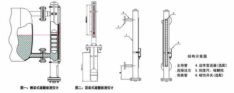 测量液体时采用顶装或旁通管侧装方式。磁翻柱主体外加装翻柱液位指示器、液位开关及液位变送器。磁单元置于浮球内部或通过顶杆与浮球相连,当浮球连带磁单 元随液位变化时,使磁性色块(磁翻板)翻转;磁性液位开关在对应液位点动作;同时液位传感器在浮球磁力的作用下,输出标准的变化电阻信号,再经过变送器把电阻信号转换 成4~20mA电流信号输出。