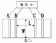 如果方阻值比较小,如在几个欧姆以下,因为存在接触电阻以及万用表本身性能等因素,用万用表测试就会存在读数不稳和测不准的情况。这时就需要用专门的用四端测试的低电阻测试仪器,如毫欧计、微欧仪等。测试方法如下:用四根光洁的圆铜棒压在导电薄膜上,如图二所示。四根铜棒用A、B、C、D表示,它们上面焊有导线接到毫欧计上,我们使BC之间的距离L等于导电薄膜的宽度W,至于AB、CD之间的距离没有要求,一般在10--20mm就可以了,接通毫欧计以后,毫欧计显示的阻值就是材料的方阻值。这种测试方法的优点是:(1)用这种方法毫欧计可以测试到几百毫欧,几十毫欧,甚至更小的方阻值,(2)由于采用四端测试,铜棒和导电膜之间的接触电阻,铜棒到仪器的引线电阻,即使比被测电阻大也不会影响测试精度。(3)测试精度高。由于毫欧计等仪器的精度很高,方阻的测试精度主要由膜宽W和导电棒BC之间的距离L的机械精度决定,由于尺寸比较大,这个机械精度可以做得比较高。在实际操作时,为了提高测试精度和为了测试长条状材料,W和L不一定相等,可以使L比W大很多,此时方阻Rs=Rx*W/LRx为毫欧计读数。