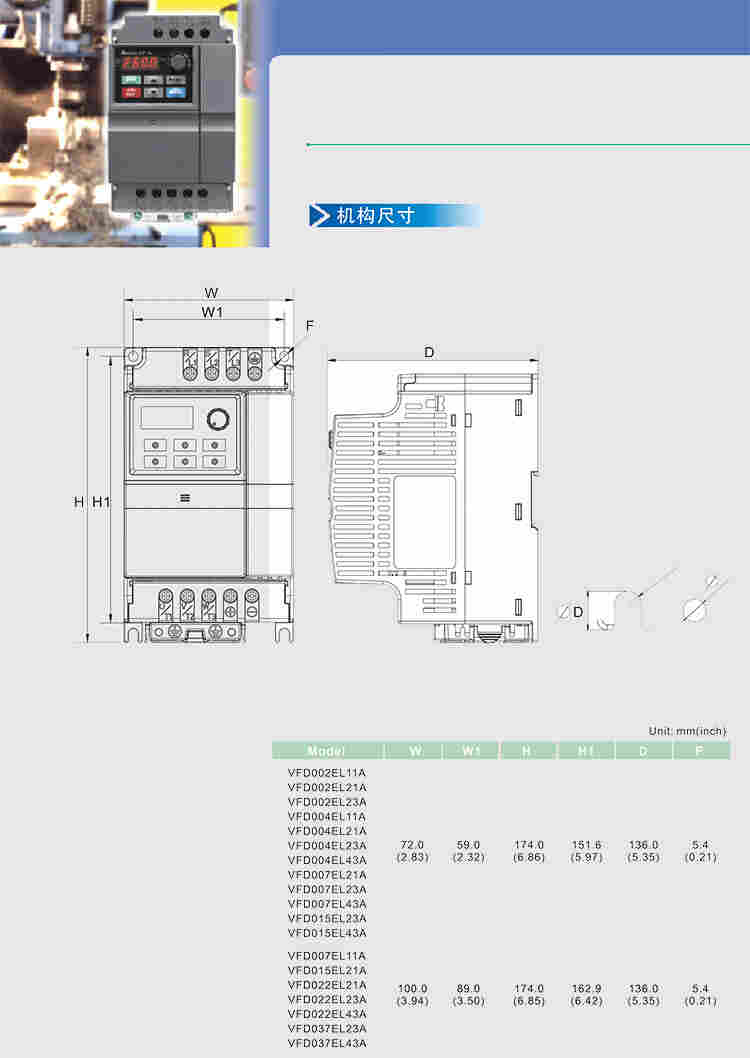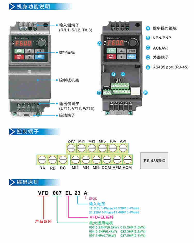 常州台达变频器代理,常州台达代理,台达变频器代理商 VFD-EL型台达变频器产品特色: ▲ 输出频率0.1~600Hz▲ 3点任意 V/F 曲线 ▲ 内置PID回授控制 ▲ RFI-switch 应用于非接地电源系统 ▲ 内置EMI 滤波器 (230V 1 phase and 460V 3 phase机种) ▲ 采用RS-485通信界面(RJ-45),标准Modbus通讯协议 ▲ 多样化通讯模块,支持多种通讯协议,如Profibus,DeviceNet,LonWorks及CANopen ▲ 完整保护功能 ▲ 可选购数字操作面板及监控软件