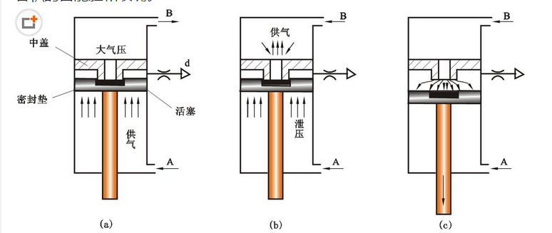 第二阶段,压缩空气改由孔B进气,输入蓄气缸中,冲击缸下腔经孔A排气。由于活塞上端气压作用在喷嘴上的面积较小,而活塞下端受力面积较大,一般设计成喷嘴面积的九倍,缸下腔的压力虽因排气而下降,但此时活塞下端向上的作用力仍然大于活塞上端向下的作用力。