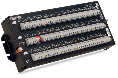 AM16/32B 扩展板一种为16*4,通过4个COM端子连接,另一种为32*2,通过2个COM端子连接。COM端子与数据采集器模拟输入,激发通道或接地端口通过线缆连接,这由传感器的情况而定。数据采集器通过2个控制端口控制跨展板,或通过一个控制端口一个激发通道来控制扩展板。