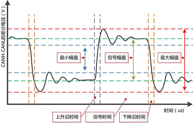 CANScope的 “信号质量”分析插件可以通过分析每个CAN节点发出的波形,自动对其的小电压幅值、大电压幅值、信号幅值、波形上升沿时间、波形下降沿时间、信号时间进行综合“评分”,然后通过柱状图来直观显示出每个CAN帧ID的信号质量。用户无需深入了解CAN总线协议、眼图、斜率、幅值、振铃、地弹等等知识。只需使用CANScope采集一段时间后,点击鼠标即可自动完成分析工作。如图2所示。为六个测量评价的参数。