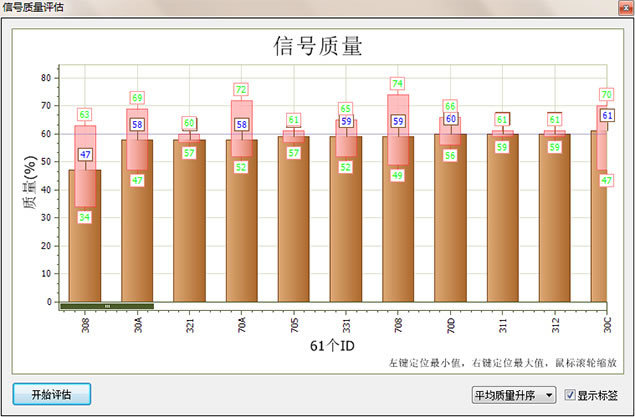 如图3所示。为某地铁车辆上的CAN总线实际测试结果,通过信号质量的升序排列,可以看到发出帧ID为0x308的这个节点,信号质量平均值只有47分,差值甚至只有34分,
