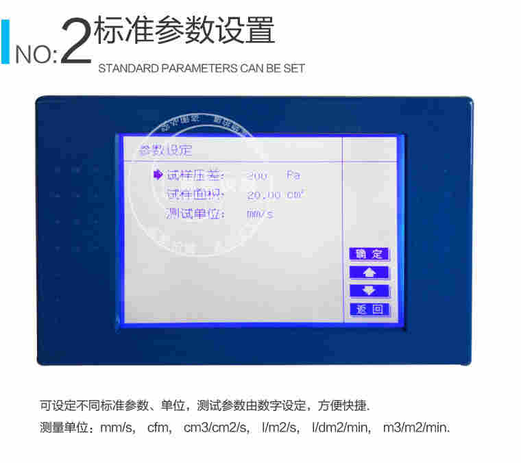 各国试验标准规定的压差并不一致,美国ANSI/ASTM、D773、FS191/5450及日本的JISL1096规定为 127.4Pa(约13mm水柱);法国NF G07-111规定为196Pa(约20mm水柱);德国DIN53887规定服装织物为100Pa(10mm水柱)、降落伞织物为160Pa(16mm水柱)、过滤织物及工业用织物为200Pa(20mm水柱);英国BS5636规定为98Pa(约10mm水柱);ISO9237规定与德国相同;我国原标准GB 5453-85与美国相同;新标准则与ISO相同。