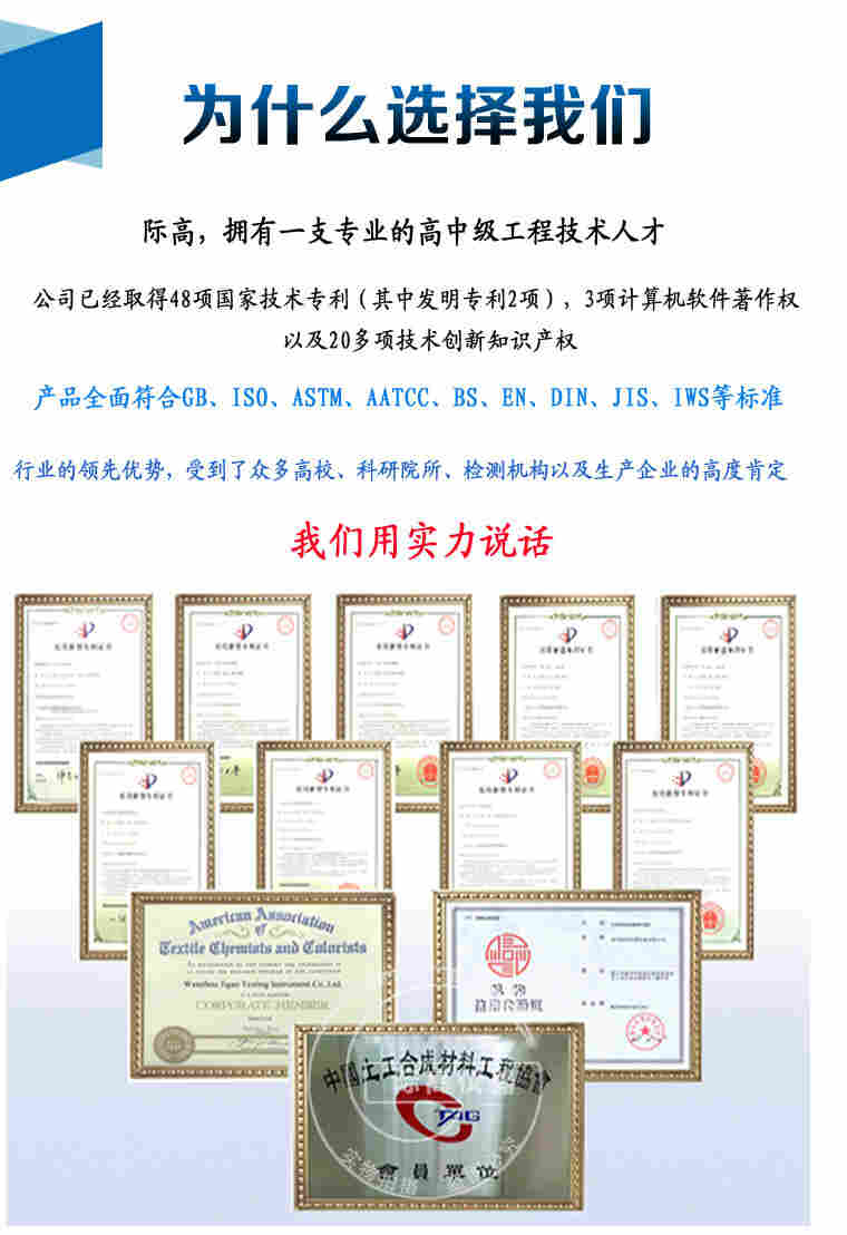 随着我国纺织检测事业的迅速发展,各检测机构以及企业实验室都不同程度地扩大检测项目,斥巨资购入各种大型精密仪器已司空见惯.然而如何对这些精密仪器进行科学管理、正确使用和维护,如何做好精密仪器的后继开发利用,成为各个实验室管理和发展中的重要问题。我们首先学了解下织物透气量仪的实验室保养和维护的一些方法。首先,要加强对实验技术人员的基本操作训练,使他们熟悉织物透气量仪性能特点,掌握基本操作方法,避免因操作不当或失误造成损坏事故,特别是织物透气量仪的标准试验操作使用,要严格执行持证上岗的制度,严禁未经培训、考核不合格人员私自操作本仪器。第二,织物透气量仪要定期清洁、除尘,定期通电,防止元器件受潮损坏。要定期进行部位检测、性能检测,了解清楚其技术状态,保证仪器设备经常处于良好的工作状态。第三,实验室空调器室内机及去湿机的防沉滤网至少半个月 清洗一次,室外机要定期维护清洁,提高散热效果。这既是提高效率、效果的需要,又是防止过载诱发火灾的和损坏设备的需要。第四,织物透气量仪附件(孔板、试样定值圈)直接关系到 测试精度,不允许用抹布直接擦试,如有沾污,应用吹耳球吹拂其表面灰尘。第五,气流量筒内有精密传感元件,更换喷嘴和清洁时动作应轻柔,以免发生意外。第六,为检查或更换保险丝,要把仪器的电源插头拔下,旋开保险丝旋钮盖,就可以取出保险丝了,如果需要更换保险丝,请使用相同额定电流的保险丝。后,就是要告诉大家,织物透气量仪一定要按照厂家的说明书进行定期保养啦!