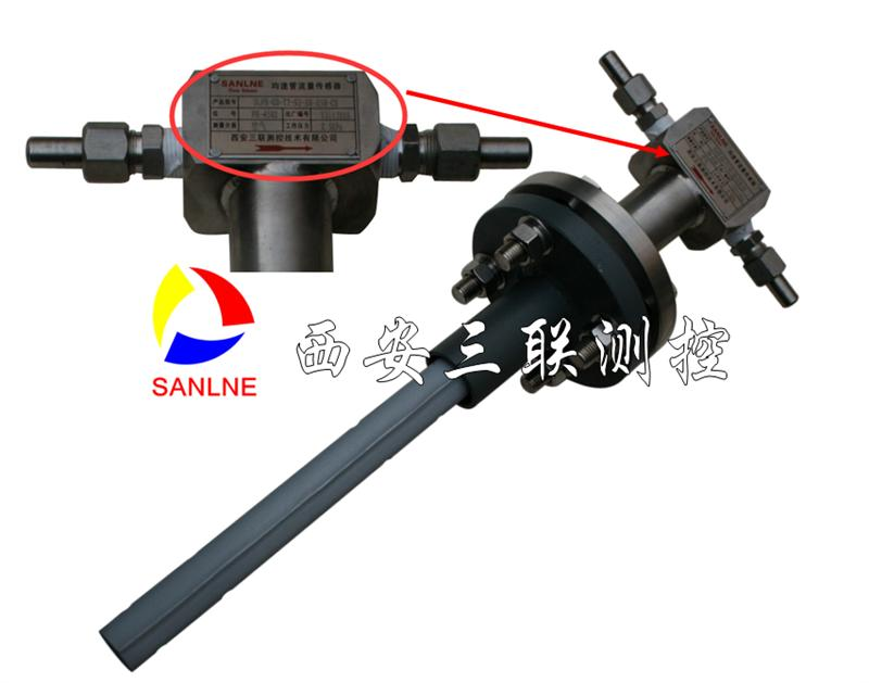 传感器是由检测杆、取压口和导杆组成,它横穿管道内部与管轴垂直,在测杆的迎流面上设有多个测压孔测量的压力平均值,在其背、侧流面有测量静压测压孔,分别由压导压管和静压导压管引出,根据压与静压的差压值,计算流经管道的流量。也可以用流量管壁静压代替传感器背流面的静压。