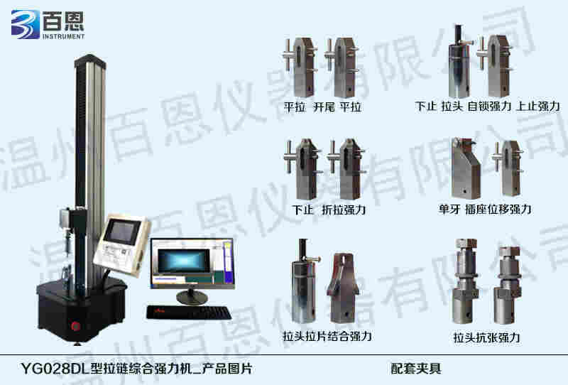 温州百恩仪器有限公司生产的这款YG028DL型拉链综合强力机,功能非常强大,测试十分。主要是用于拉链的平拉、上止、下止、开尾平拉、插座移位、拉头拉片结合、拉头自锁及拉头抗张、抗扭等强力测试。并且荣获两项(号1:2.1 号2:2.9 )及一项知识产权局软件著作权(证书号:2015SR228080)。