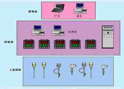 整个系统可分为管理层、控制室、工业现场,也可只 分操作站和工业现场两层,管理层可供工厂领导浏览现场 实时工况画面,也可进行使用权限、系统配置等的高级设 置。操作站供仪表班和技术人员进行实时监控,工业现场 提供各种控制信号,如模拟量输入/输出和开关量输入/输 出。