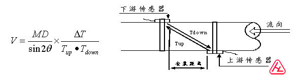 当超声波束在液体中传播时,液体的流动将使传播时间产生微小变化,并且其传播时间的变化正比于液体的流速,其关系符合下列表达式: