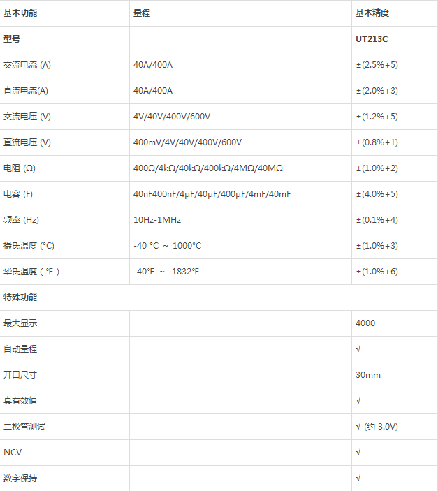 UT213 系列真有效值数字钳形表是具备高可靠性、高安全性、自动量程、手持式鉗形表等特点.全量程过载保护和的外观设计,使之成为性能更为的新一代实用电工测量仪表。