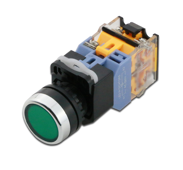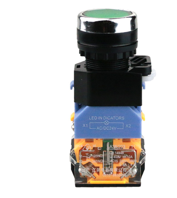 浙江巨霸电气按钮开关是一种按下即动作,释放即复位的用来接通和分断小电流电路的电器。一般用于交直流电压440V以下,电流小于5A的控制电路中,一般不直接操纵主电路,也可以用于互联电路中。在实际的使用中,为了防止误操作,通常在按钮上做出不同的标记或涂以不同的颜色加以区分,其颜色有红、黄、蓝、白、黑、绿等。一般红色表示“停止”或“危险”情况下的操作;绿色表示“启动”或“接通”。急停按钮必须用红色蘑菇头按钮。按钮必须有金属的防护挡圈,且挡圈要高于按钮帽防止意外触动按钮而产生误动作。安装按钮的按钮板和按钮盒的材料必须是金属的并与机械的接地母线相连。