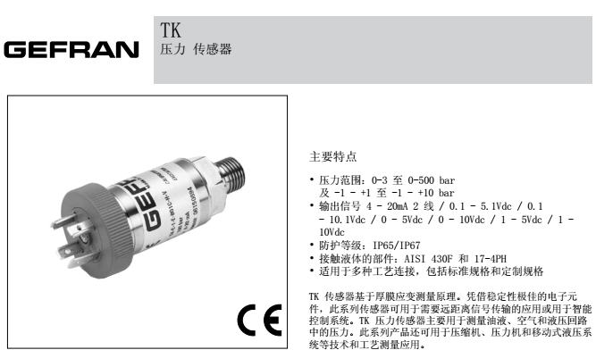 GEFRAN压力传感器有TP/TPA系列、TPF/TPFA系列、TPH/TPHA系列、TK系列、XSA系列、XPSA系列、TPS系列、TDP系列、TKDA系列。