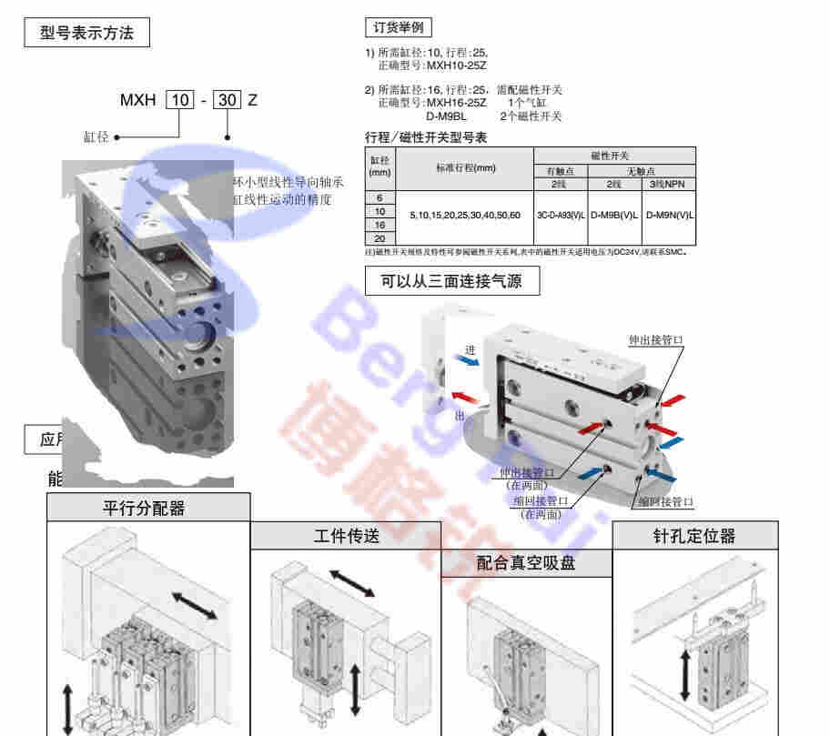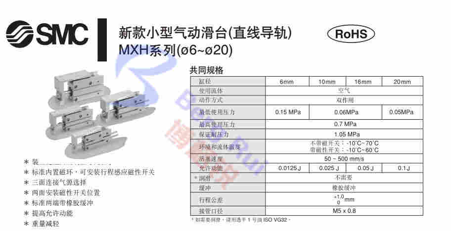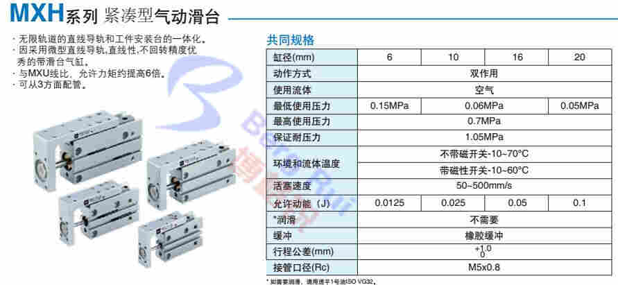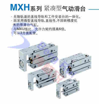 MXH系类迷你滑台实现三面气源安装,两面磁性开关安装的选择,标准两端橡胶缓冲提高了允许动能,重量减轻。MXH Series mini sliding table to achieve three-side gas source installation, both sides of the selection of magnetic switch installation, the standard two-sided rubber buffer to increase the allowable kinetic energy, weight reduction.