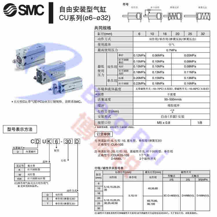 CDU系类自由安装气缸特点:缸筒与杆盖压铸成一体,无杆侧端盖用弹性挡圈固定。缸体为长方形,不需托架,从哪个方向都可直接安装,故称为自由安装型气缸。这种气缸不仅省空间,而且安装精度高,强度增强。CU series of free installation of the cylinder characteristics: cylinder and rod cover pressure into one, without rod side end cover with elastic retaining ring fixed. Cylinder body is rectangular, do not need bracket, from which direction can be installed directly, it is called free installation type cylinder. This kind of cylinder not only save space, but also has high installation precision and strength.