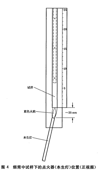 6.8 放好玻璃板,用本生灯火焰内核顶部在试样下端中心点火10s,在将本生灯火焰移至试样时,立即开动计时器,并保持本生灯在点火时始终与垂直方向成15°角。