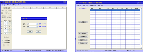 控制软件:本软件自带数据库,只需输入地名和时间等,即可自动计算某时某地的太阳高度角和方位角并驱动电机控制模拟太阳定位;同时,如配置我公司的照度测试系统及我公司自行开发的用于智能日照模拟及人工天穹的通用软件,可自动计算采光曲线和采光系数及照度分布情况等。