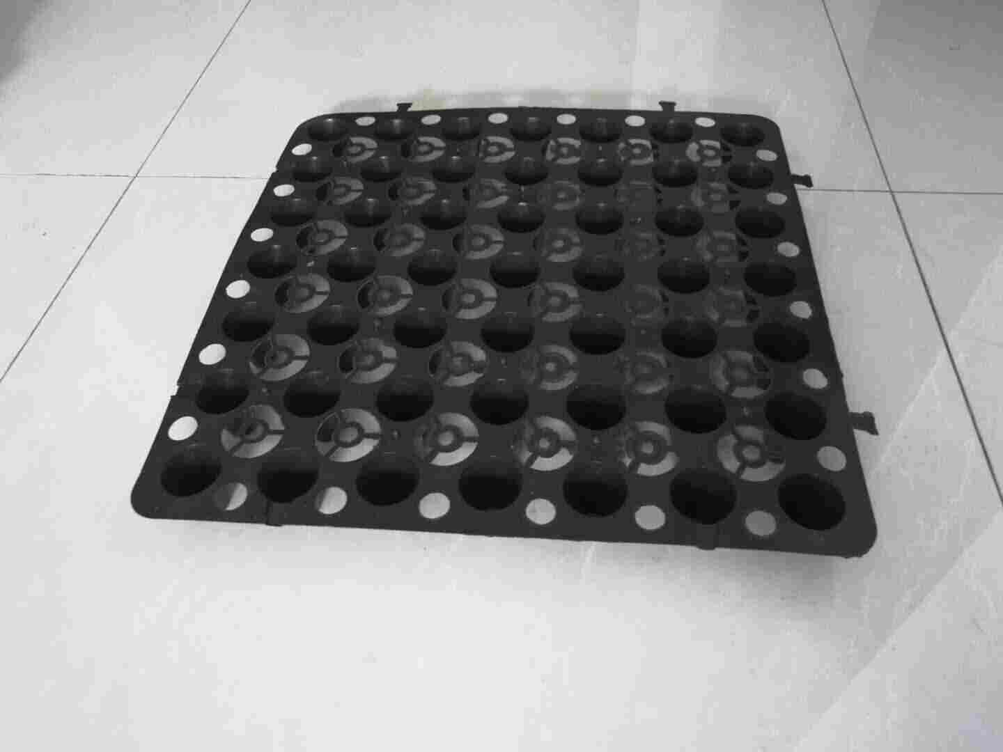该种板材自身就具有蓄水孔,可以达到有序蓄水功能,板材具有空间刚度极高的特点,抗压性明显优于同类产品(可以通过现场试验检验),能够承受400Kpa以上的高抗压负荷,同时可以承受在种植顶板回填土过程中机械碾压的极端负荷情况。