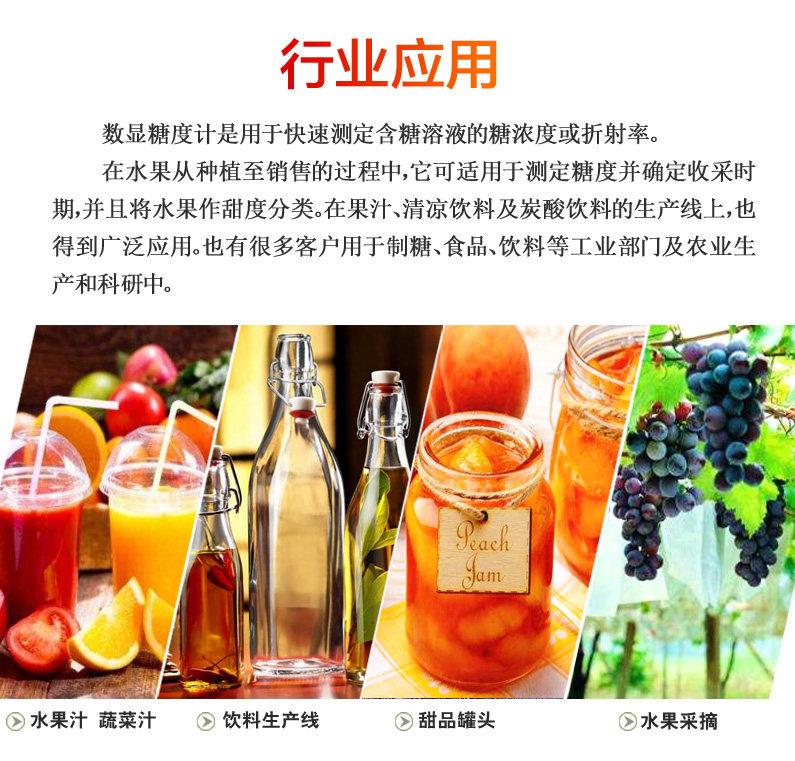 糖度检测是评价果蔬质量的一个重要指标,在水果上市之前使用数显糖度计对水果的糖度进行测量能够有效控制水果的上市时间,作甜度分级分类,保证水果质量,以达到*的经济效益。