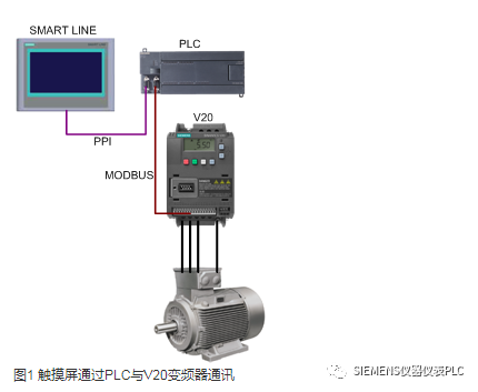 通常情况下,要实现HMI设备与V20变频器的通讯,需要一个支持USS通讯或MODBUS通讯的PLC,比如S7-200系列PLC。其通讯电缆连接如图1所示。PLC的一个通讯端口与触摸屏连接,可以采用PPI协议通讯。PLC的另一个通讯端口与V20的RS485通讯端口连接,采用MODBUS协议通讯,PLC上编写MODBUS主站程序,V20为从站。