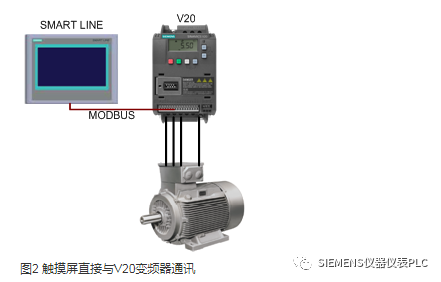 如果只需要对V2O变频器做简单的运行控制和变量监视,那么上述配置中PLC的作用仅为数据中转。这种情况下,触摸屏直接和V20变频器通讯,不仅能够实现监控功能,而且可以少用一个PLC,节省成本。采用西门子的SMART LINE系列触摸屏能够实现与V20变频器直接通讯的功能。通讯电缆连接如图2所示。SMART LINE触摸屏作为MODBUS主站,V20为从站。