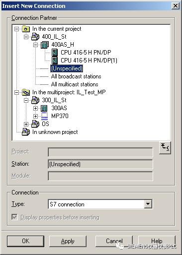 在弹出的新窗口中选择连接伙伴方。如果S7-300 CPU和S7-400 CPU处在同一个项目中,则可以直接选择;如果处在不同的项目中,则需要选择一个“Unspecified”(未),点击“Apply”应用即可。