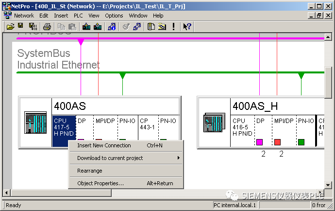 在S7-400 CPU的AS所在的单项目中点击工具栏上的按钮,打开网络组态NetPro。在CPU上右键菜单中选择“Insert New Connection”创建新的连接: