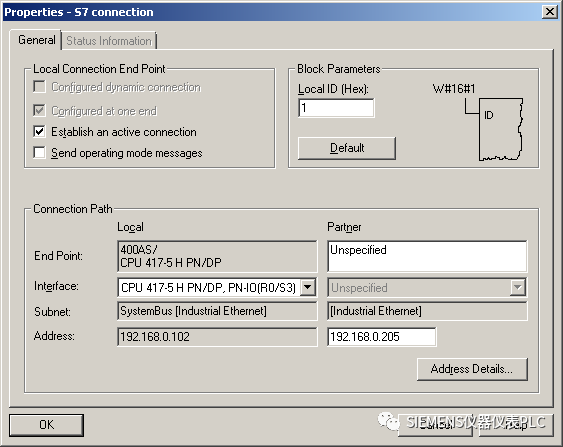 在如下所示的S7连接属性设置窗口中填写通讯伙伴方的IP地址,然后点击“Address Details…”按钮: