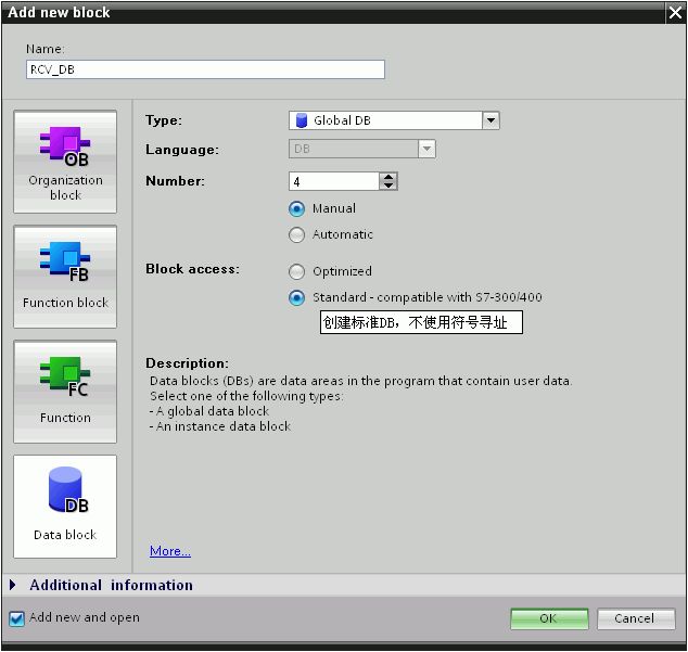 通过“Project tree”>“PLC_1”>“Program blocks”>“Add new block”,选择“Data block” 创建 DB 块,选择*寻址,点击“OK”键,定义发送数据区为 100个字节的数组,如图12及图13所示。